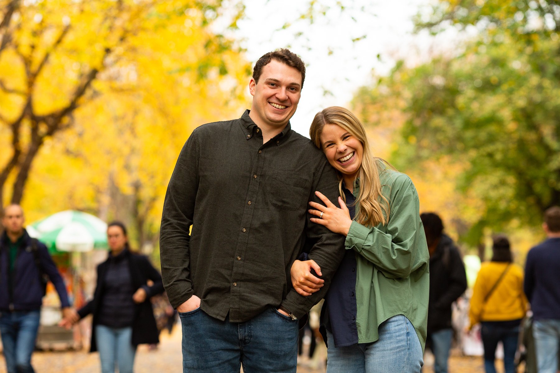 At the moment of the proposal, Austin knelt at a spot that included skyline in the background and foliage framing from above. Multiple angles were used: wide shots showing the full setting, medium shots to include foliage and structure, and close-ups for emotional detail. The location’s combination of fall color, architectural framing, and soft light contributed to strong images without needing elaborate setup.
